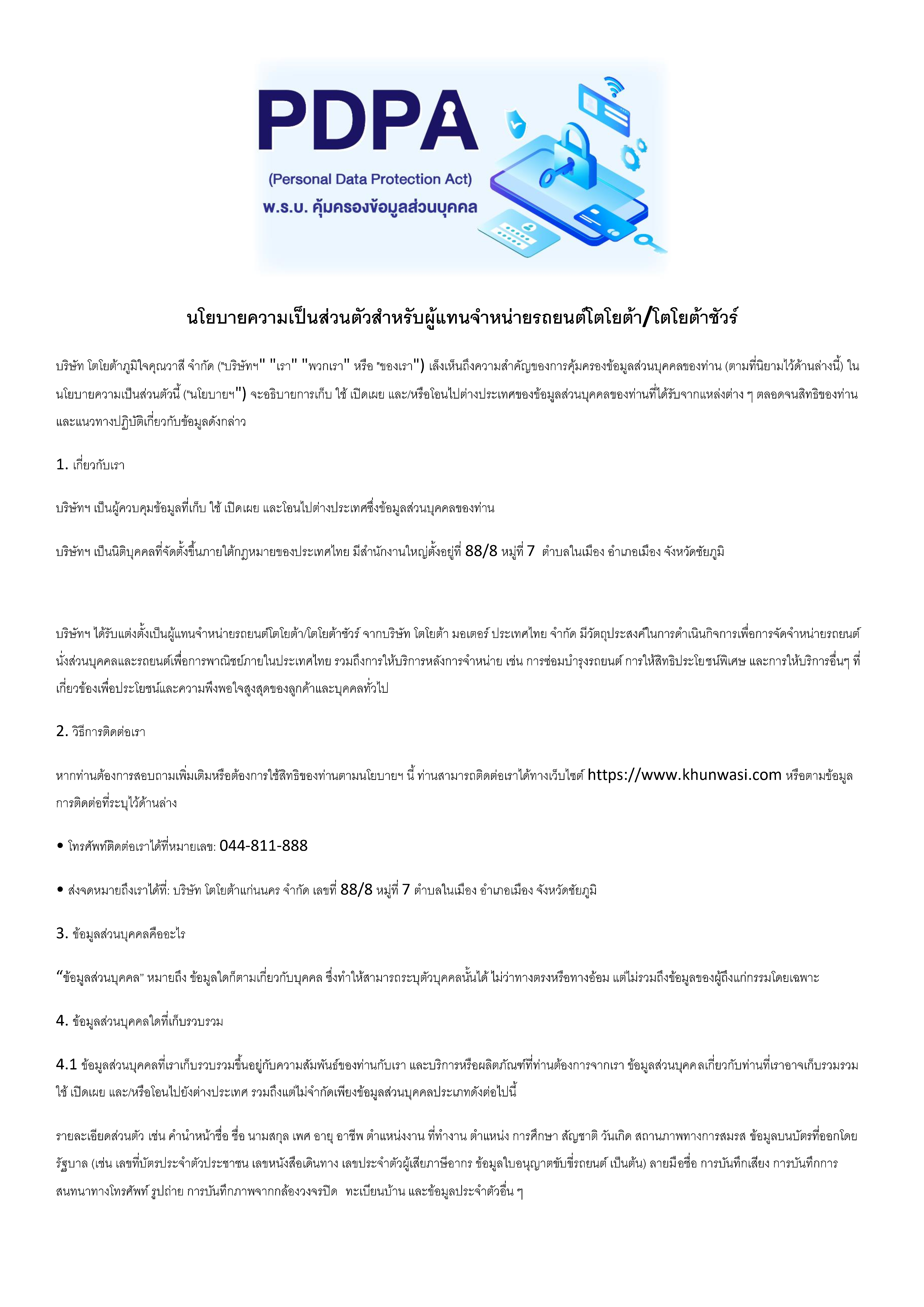 บริษัท โตโยต้าภูมิใจคุณวาสี จำกัด ("บริษัทฯ") ใช้อุปกรณ์กล้องโทรทัศน์วงจรปิด (CCTV) ในการเฝ้าดูแลพื้นที่ภายในและรอบๆ อาคารสถานที่ เพื่อคุ้มครองชีวิต สุขภาพ และทรัพย์สิน บริษัทฯ เก็บรวบรวมข้อมูลส่วนบุคคลของลูกค้า พนักงาน กรรมการ ผู้รับจ้าง ลูกจ้าง ผู้มาเยือน หรือบุคคลใดๆ ทั้งหมดที่เข้ามาในพื้นที่ที่มีการเฝ้าดูแลภายในอาคารและสถานที่ผ่านกล้องโทรทัศน์วงจรปิด (เรียกรวมกันว่า "ท่าน") นโยบายความเป็นส่วนตัวฉบับนี้ให้ข้อมูลเกี่ยวกับการที่บริษัทฯ เก็บรวบรวม ใช้ เปิดเผย และโอนข้อมูลซึ่งทำให้สามารถระบุตัวบุคคลได้ ("ข้อมูลส่วนบุคคล") เกี่ยวกับท่าน บริษัทฯ อาจแก้ไขนโยบายนี้ได้ทุกเมื่อ และจะแจ้งให้ท่านทราบเมื่อมีการแก้ไขนโยบายหากสามารถกระทำได้
