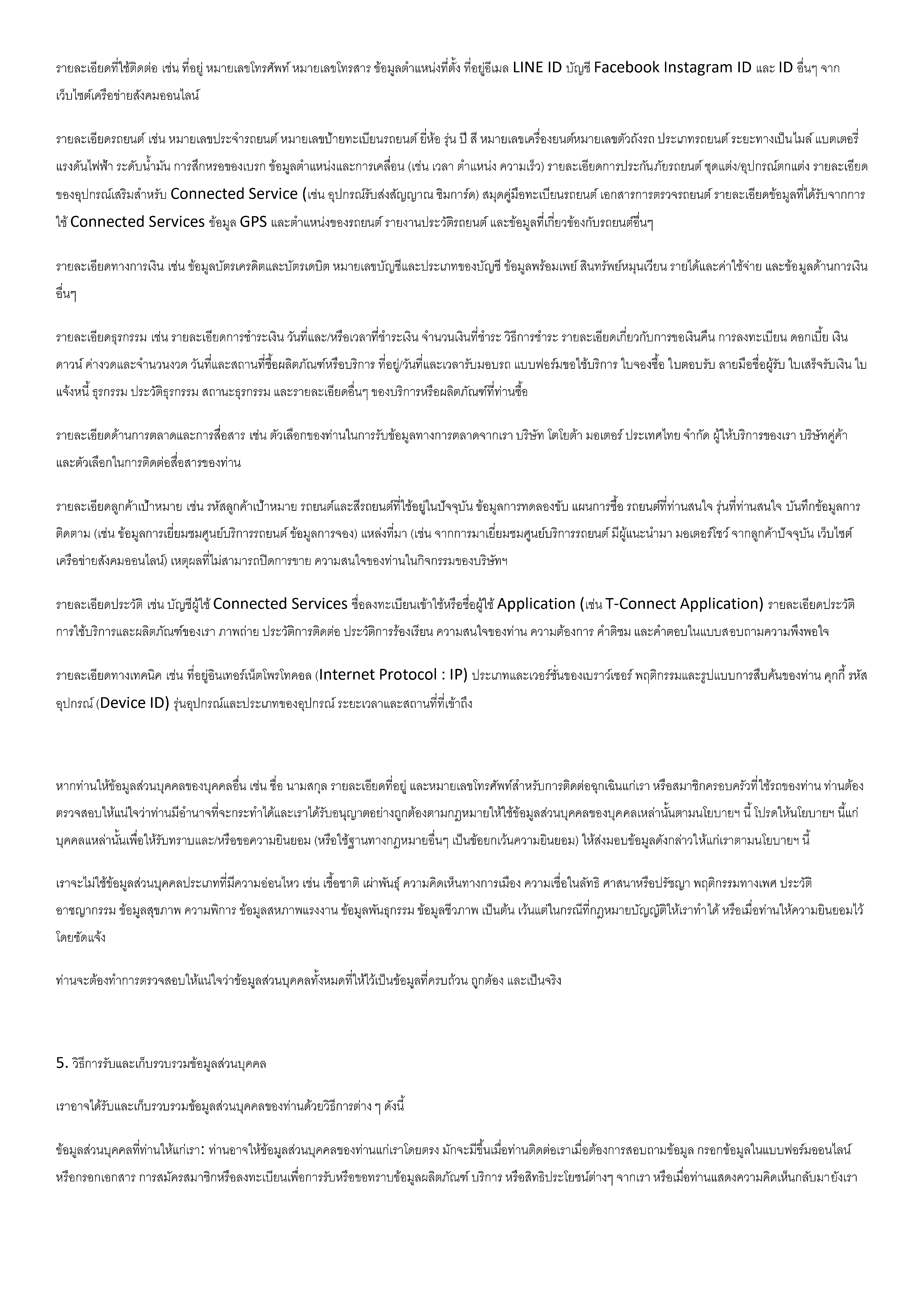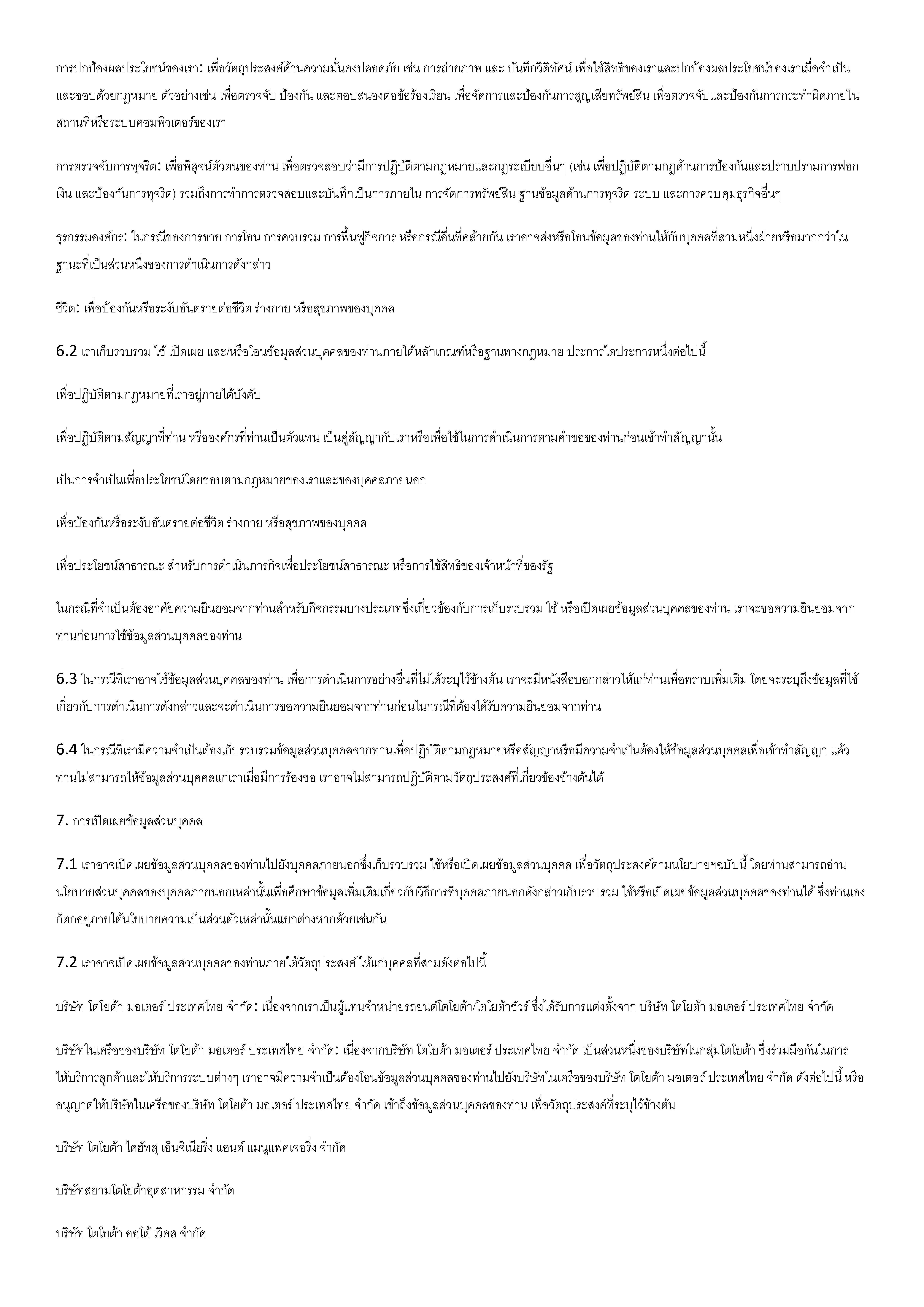 5.1บริษัทฯ อาจเปิดเผยหรือโอนข้อมูลส่วนบุคคลของท่านจากกล้องโทรทัศน์วงจรปิดไปยังบริษัท โตโยต้า มอเตอร์ ประเทศไทย จำกัด บริษัทในเครือ และผู้ให้บริการจากภายนอก ที่อยู่นอกประเทศไทย เพื่อดำเนินการตามขั้นตอนที่จำเป็นในการปกป้องสุขภาพ ความปลอดภัย และทรัพย์สินของท่าน การเปิดเผยหรือโอนข้อมูลดังกล่าวจะกระทำได้ต่อเมื่อได้รับความยินยอมจากท่านเท่านั้น เว้นแต่จะมีฐานทางกฎหมายที่สำคัญอื่นๆ (เช่น เพื่อปฏิบัติตามสัญญาระหว่างบริษัทฯ และบุคคลอื่นเพื่อประโยชน์ของท่าน) ตามที่กฎหมายที่ใช้บังคับกำหนด