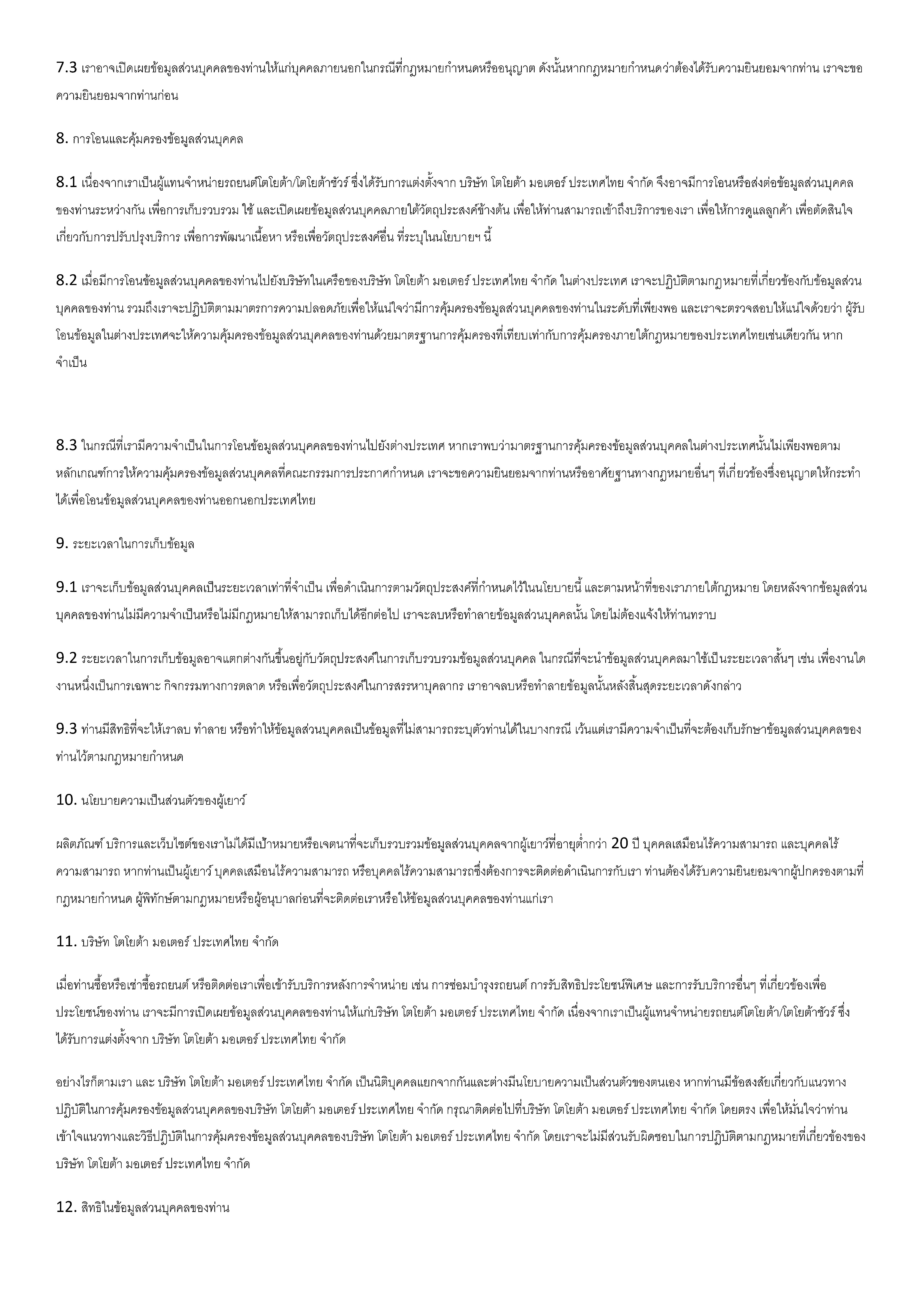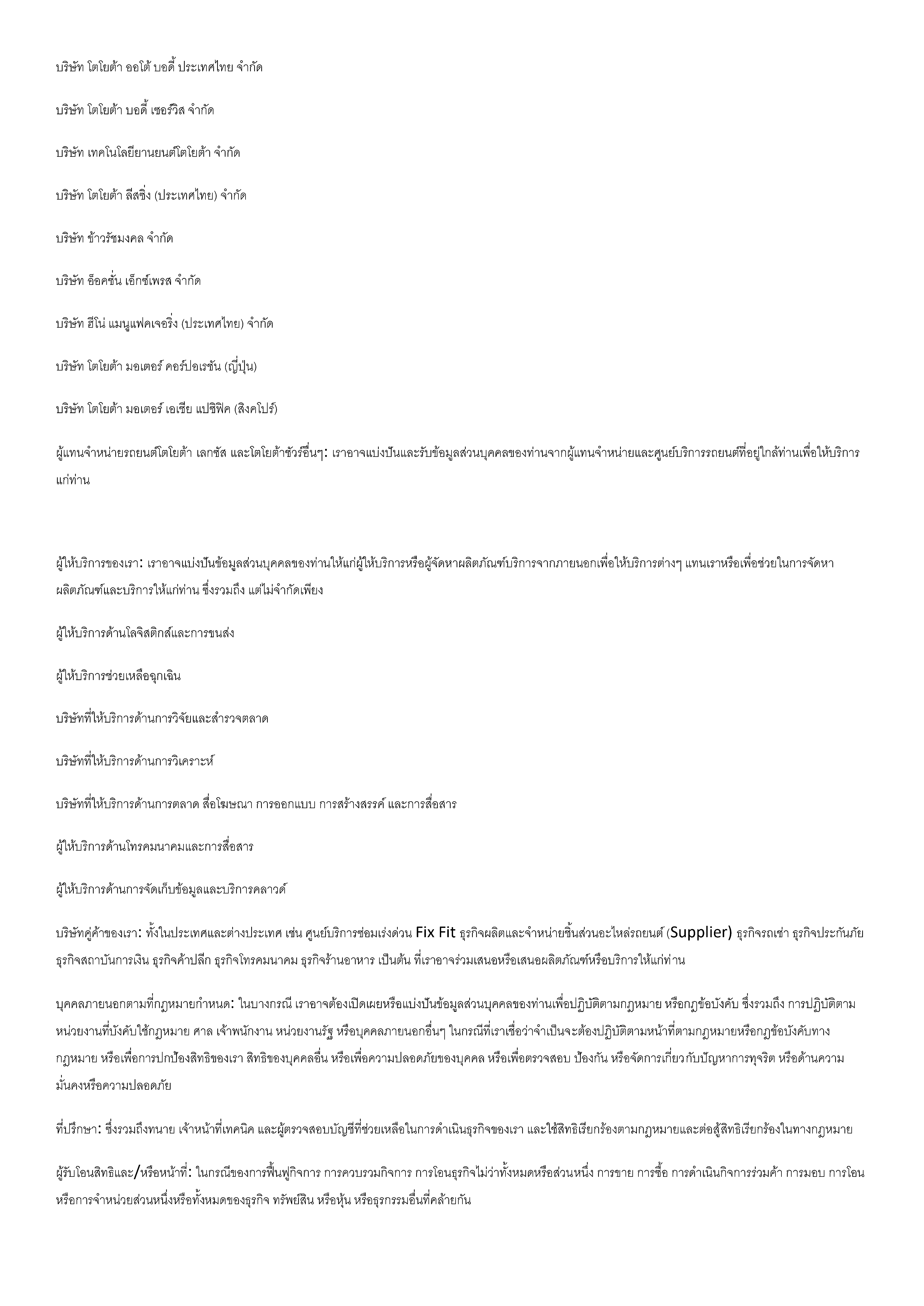 (1)บริษัท โตโยต้า มอเตอร์ ประเทศไทย จำกัด บริษัทฯ อาจเปิดเผยหรือโอนข้อมูลจากกล้องโทรทัศน์วงจรปิดและข้อมูลส่วนบุคคลอื่นที่เกี่ยวกับท่านให้แก่บริษัท โตโยต้า มอเตอร์ ประเทศไทย จำกัด เพื่อประโยชน์โดยชอบด้วยกฎหมายของบริษัทฯ และของบริษัท โตโยต้า มอเตอร์ ประเทศไทย จำกัด ในการทำตามวัตถุประสงค์ในการติดตั้งกล้องโทรทัศน์วงจรปิด