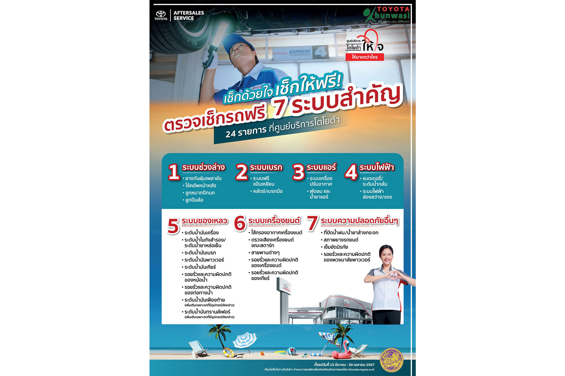 โตโยต้าให้ใจ ให้มากกว่าใคร ตรวจเช็กรถให้ฟรี 7 ระบบสำคัญ 24 รายการ โดยช่างผู้เชี่ยวชาญมาตรฐานโตโยต้า
